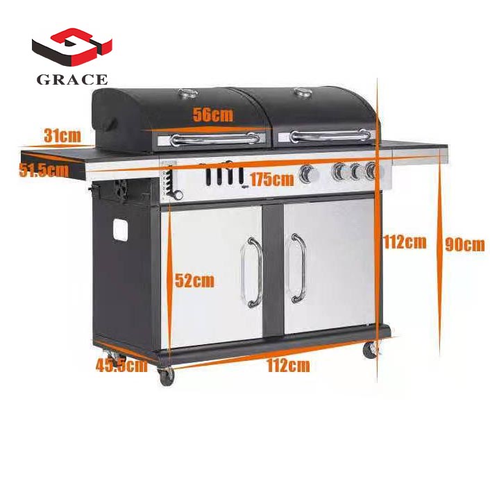 The grill measures 175x58x110 cm, making it suitable for various outdoor spaces.