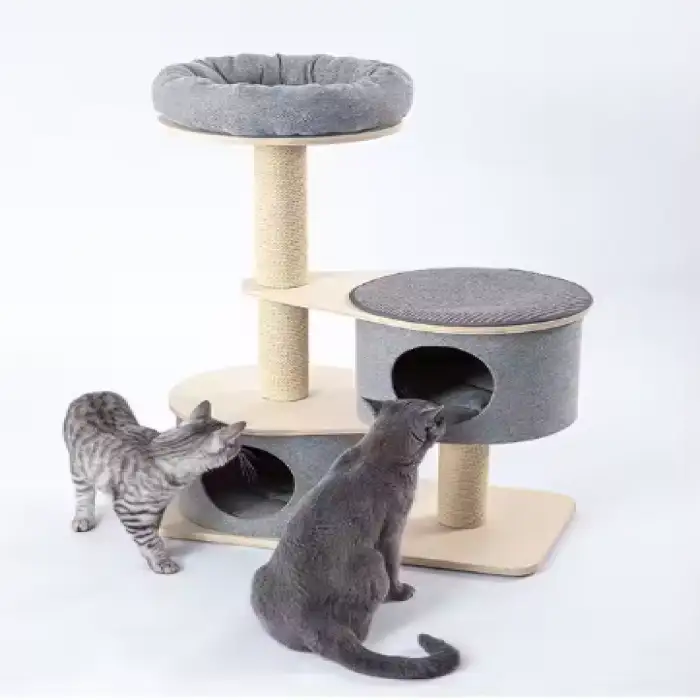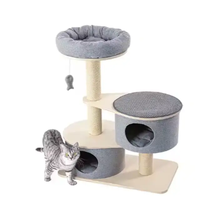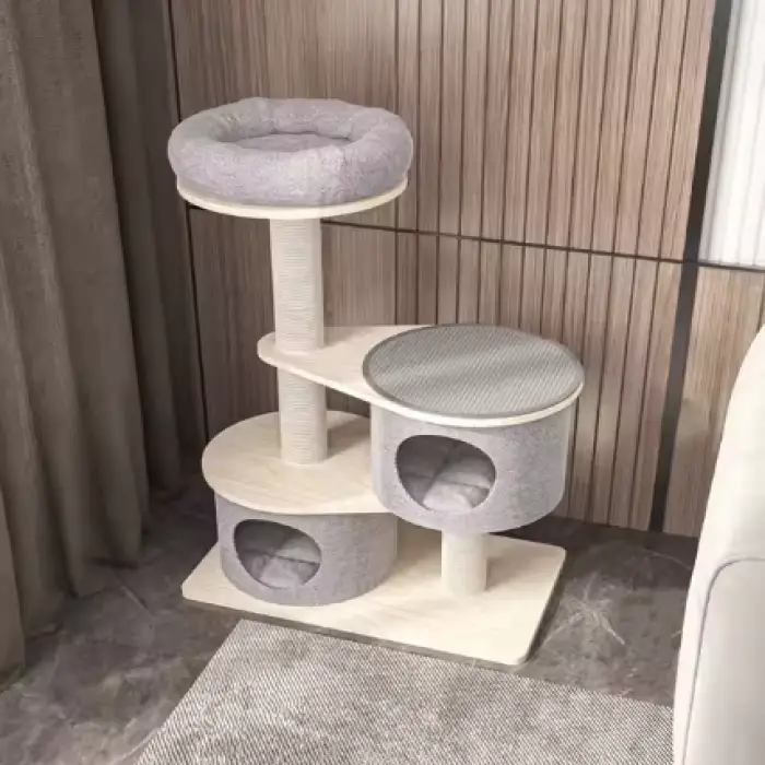 The tree house is made from durable wooden materials combined with sisal rope for scratching posts and luxurious cotton velvet for comfort.