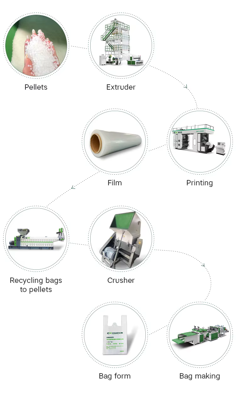 The CX-600 can produce various types of plastic shopper bags, flat bags for packaging goods, and custom bags for promotional events.