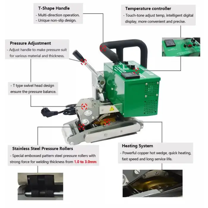 Applications include welding tarpaulin, creating dam liners, repairing plastic sheeting, and working with geomembranes.