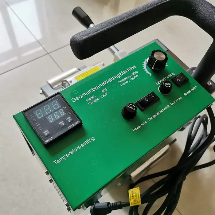 The machine is designed to weld HDPE, PVC, and PE materials, making it suitable for tarpaulin, dam liners, and various geomembranes.