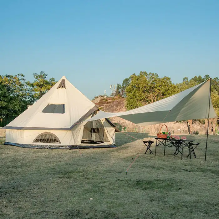 The tent measures 400x400x250 cm, providing ample space for both a bedroom and a living room area.