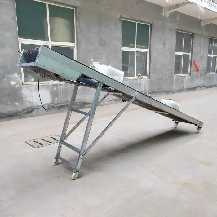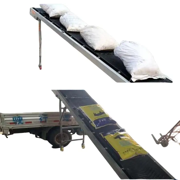The conveyor belt facilitates efficient loading and unloading of grain in warehouses, making the process faster and safer.