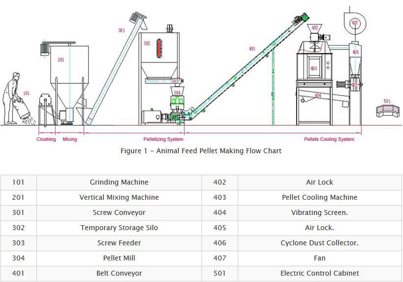 The production process involves several steps: Raw Material → Feed Grinding → Feed Mixing → Feed Pelletizing → Feed Cooling → Pellet Packing.