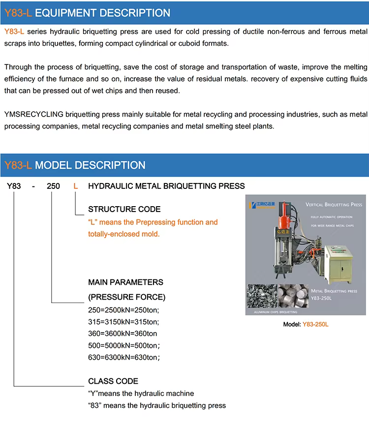 This machine is specifically designed for briquetting metal turning and shaving chips, making it suitable for various metalworking materials.