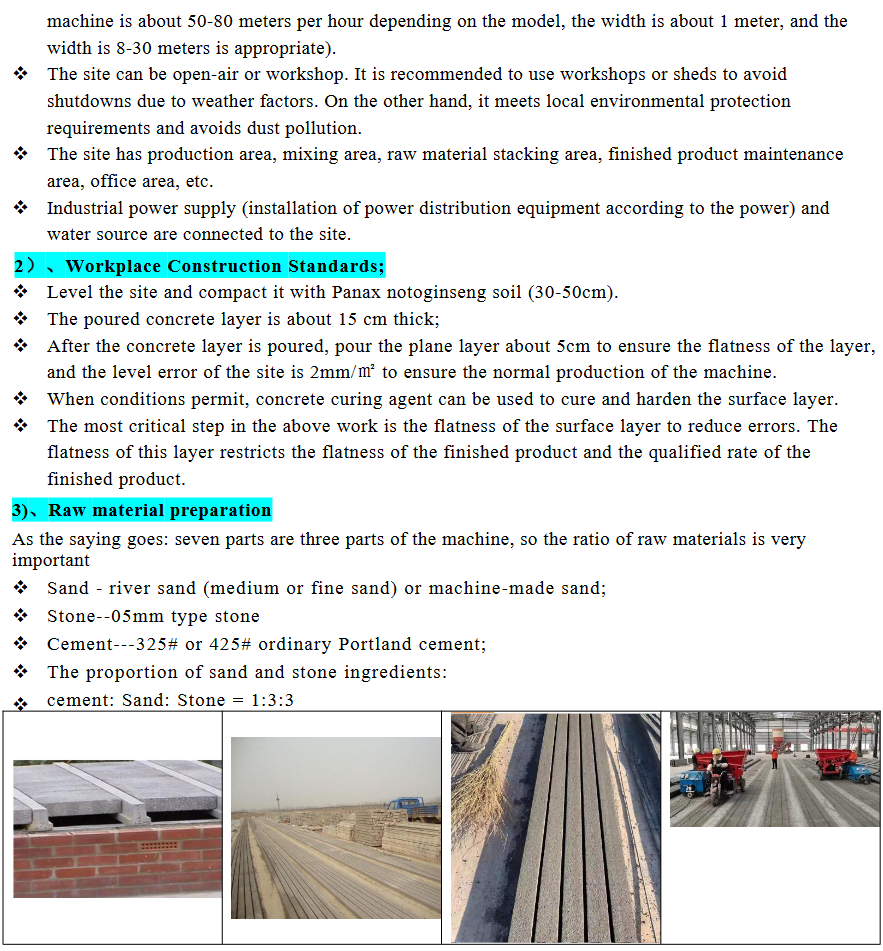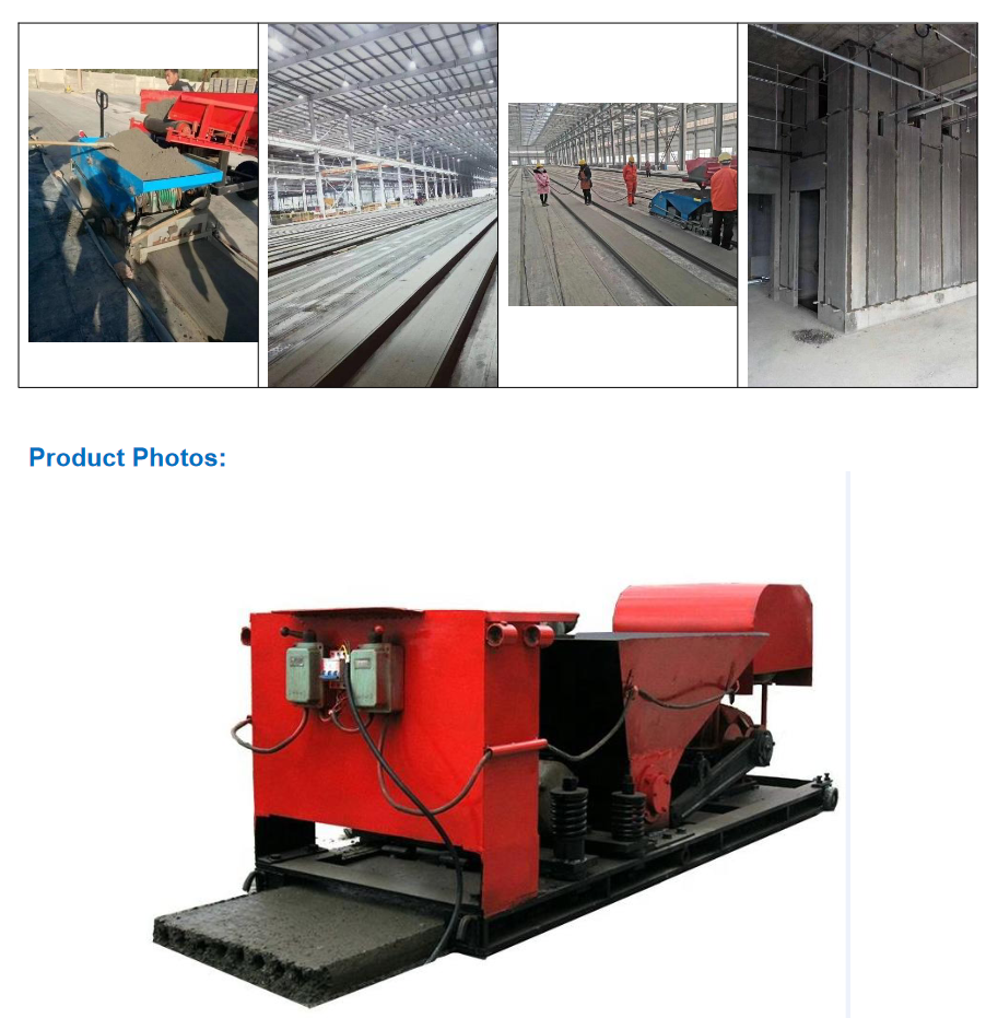 Panel types include hollow core, solid slab, ribbed and sandwich panels; sizes and thicknesses vary by model and mold configuration but typically range from 1 m to 12 m in length and 100 mm to 300 mm in thickness, with custom sizes available on request.