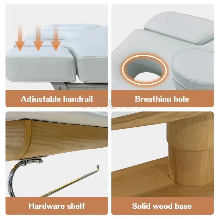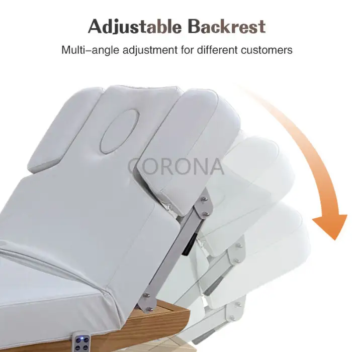 The beauty bed is equipped with three motors that allow for precise positioning of the leg, backrest, and height adjustments.