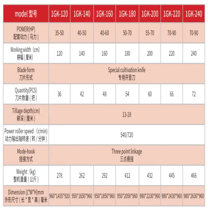 The Rotocultivador is designed for tractors with a horsepower range of 80 to 220 HP.