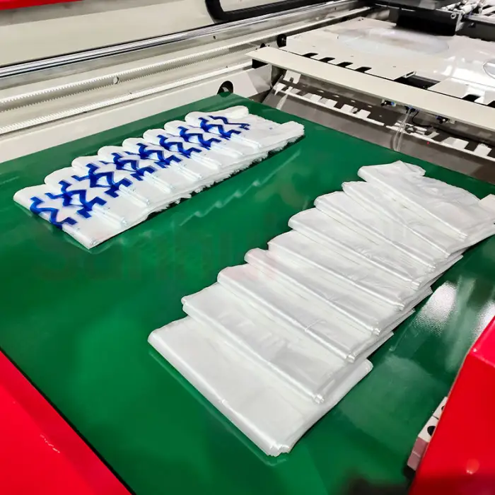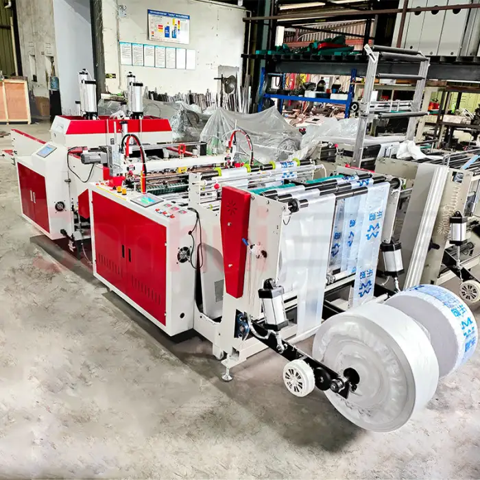 Yes, the machine includes a plastic bag cutting machine for added convenience.