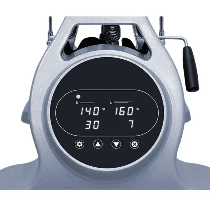 This machine features a dual heating platen for even heat distribution and semi-automatic operation, allowing for greater efficiency and better print quality.