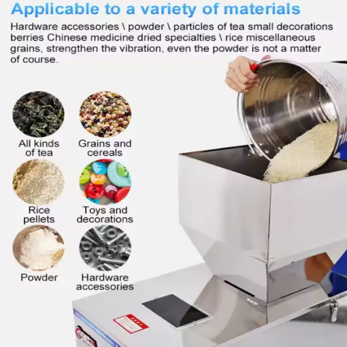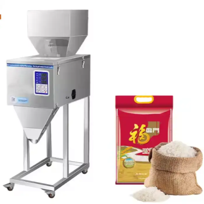 The Semi-automatic Particle Peanut Granule Rice Nuts Vertical Coffee Milk Powder Weighing Packing Filling Machine can package a variety of products including peanuts, granules, rice, nuts, coffee, and milk powder.