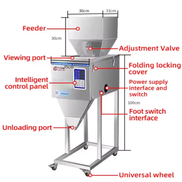 The main function of the machine is to automatically weigh and pack various products efficiently.