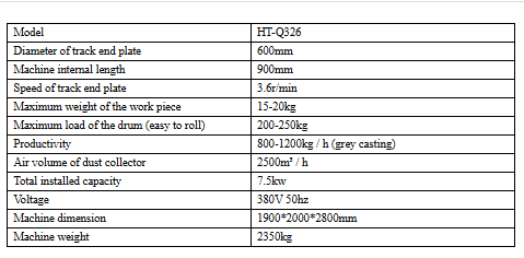The shot blasting machine operates on a power of 7.5 kW and requires a voltage of 220V/60HZ.