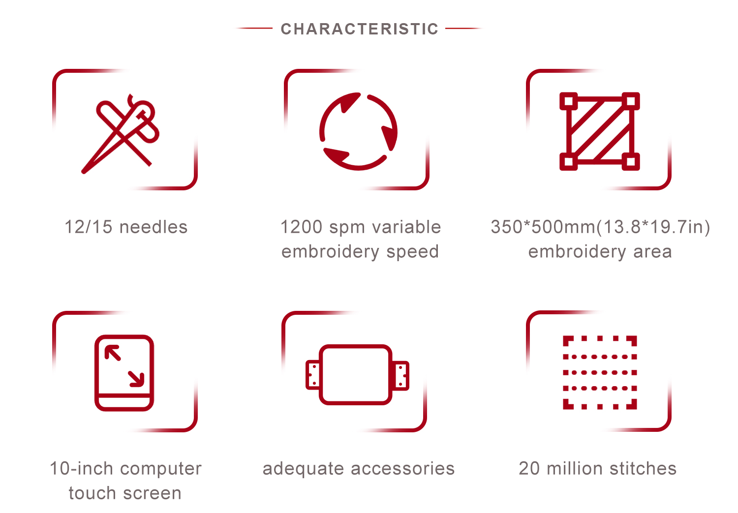 The embroidery machine is equipped with a 10-inch computer touch screen for easy operation.