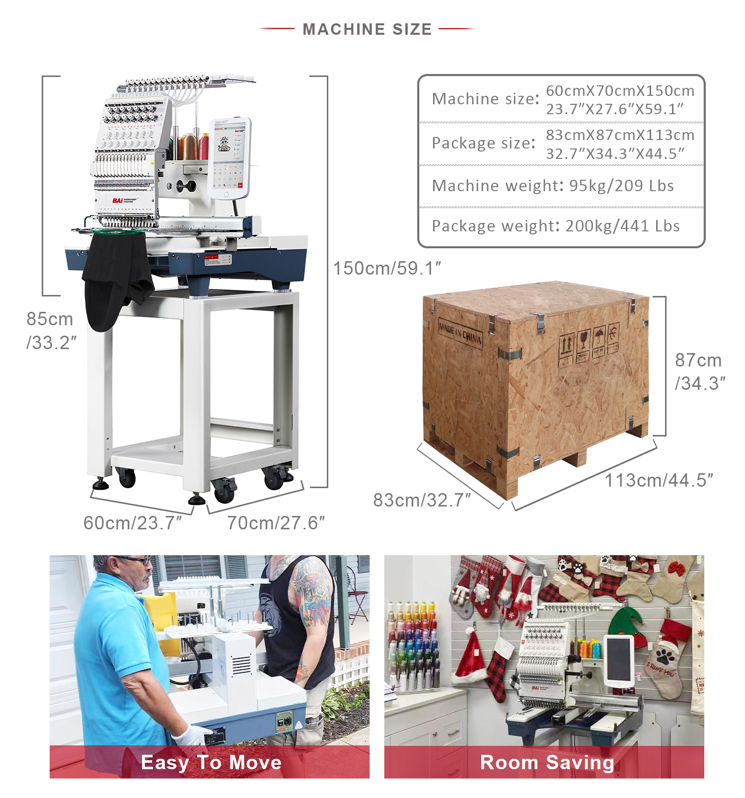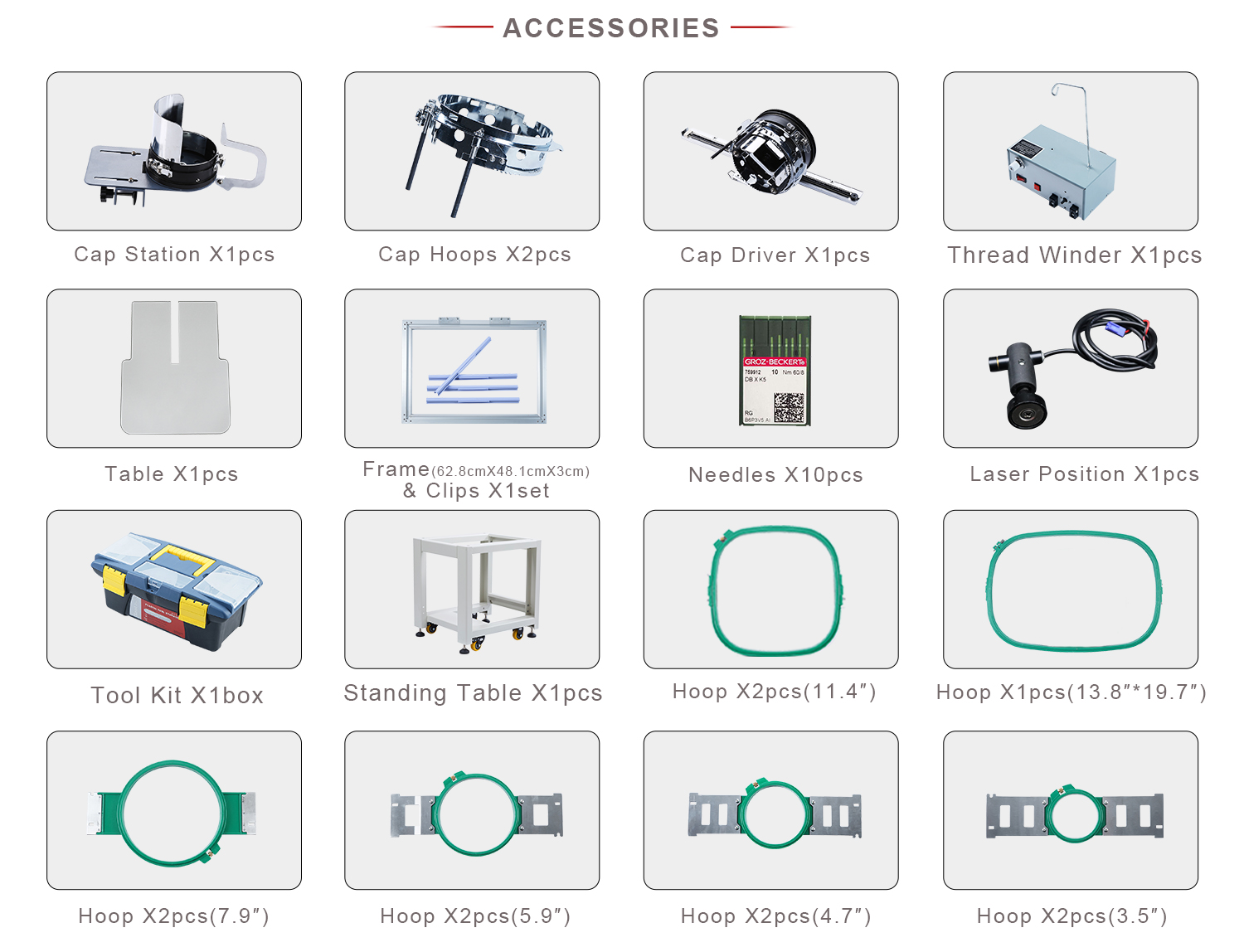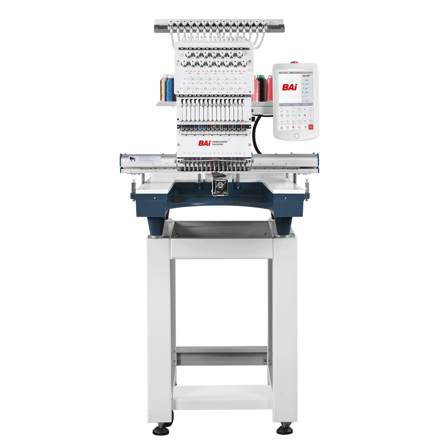This embroidery machine features 12 needles, with an optional 15 needle configuration available.