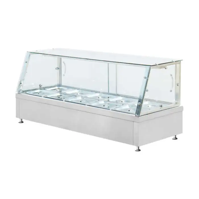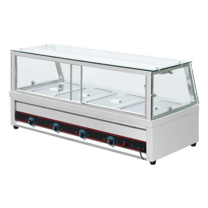 The main body is high-quality stainless steel with a straight glass front for display and easy viewing of the food.