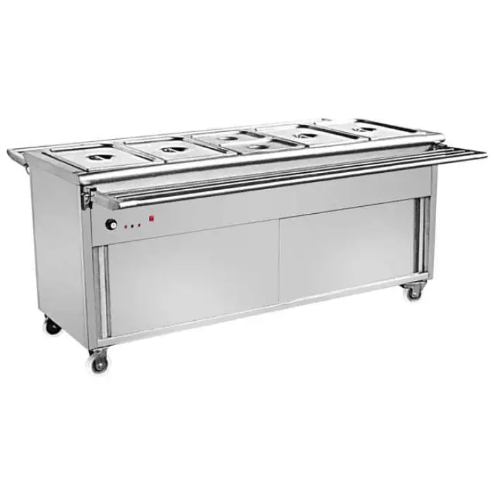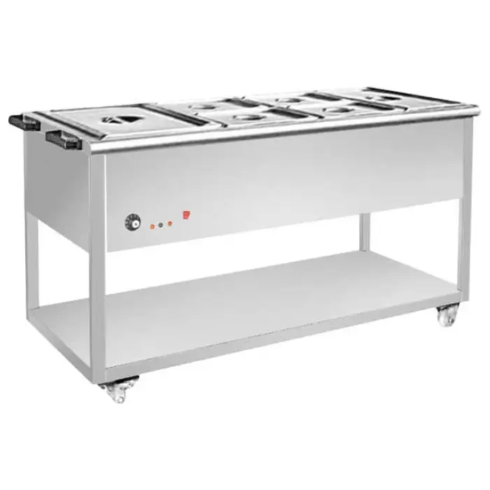 This model uses a dry filament heater (no water heater). It is described as an electric bain marie-style food warmer but operates with dry heat and adjustable temperature control rather than a water-filled bath.