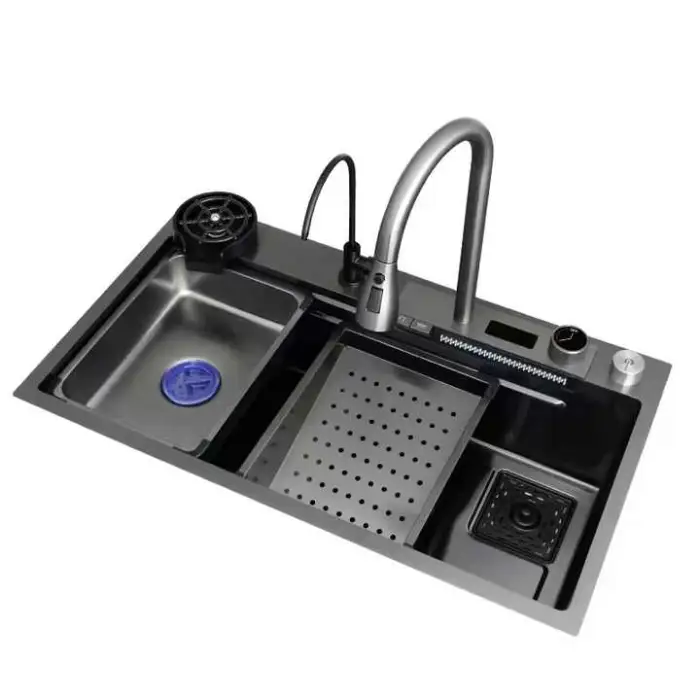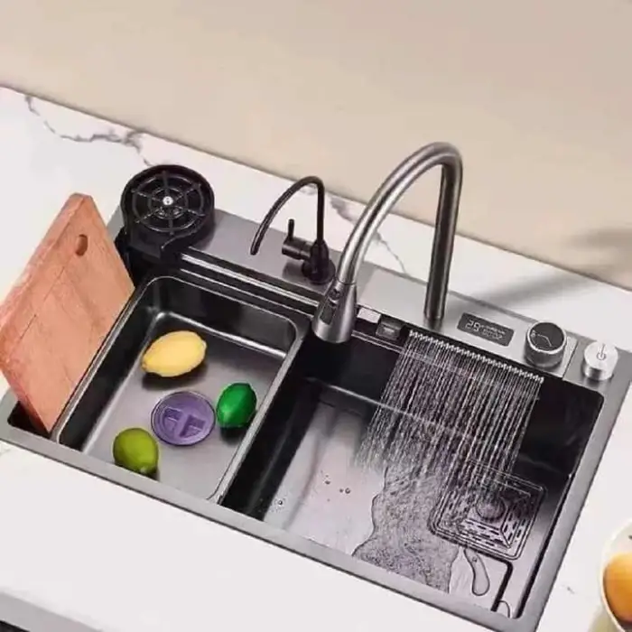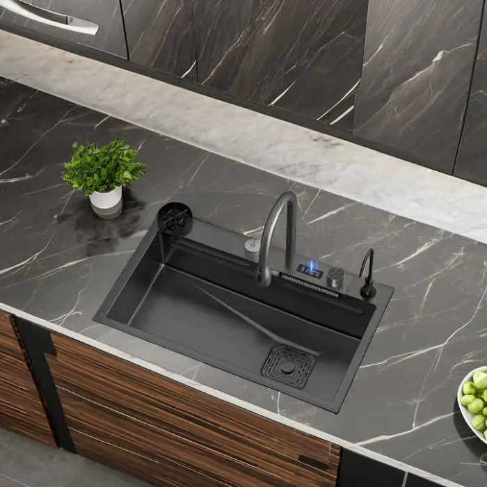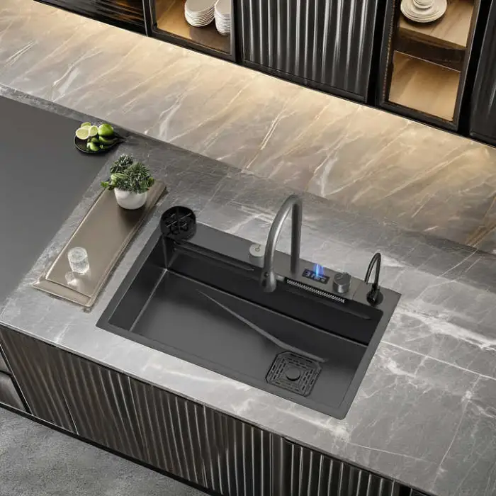 The sink is handmade and features a durable nano dark grey finish that is resistant to scratches and stains.