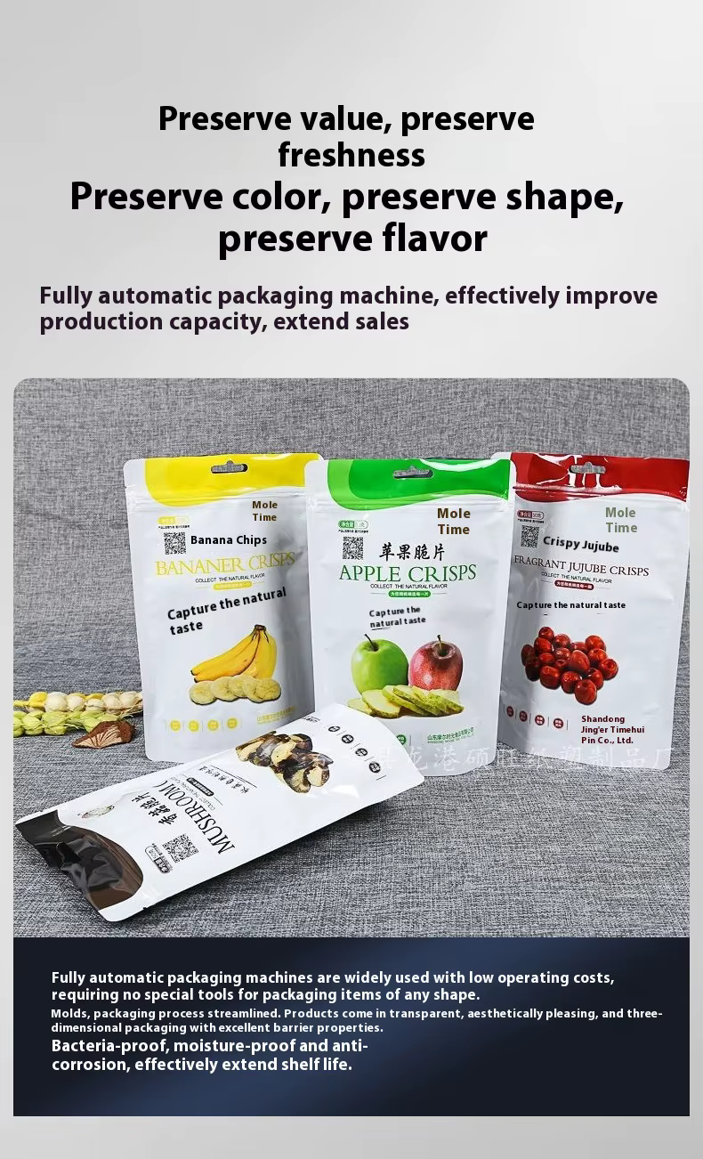 The machine uses nitrogen to fill the packaging, which helps to keep the snacks fresh by minimizing oxygen exposure.