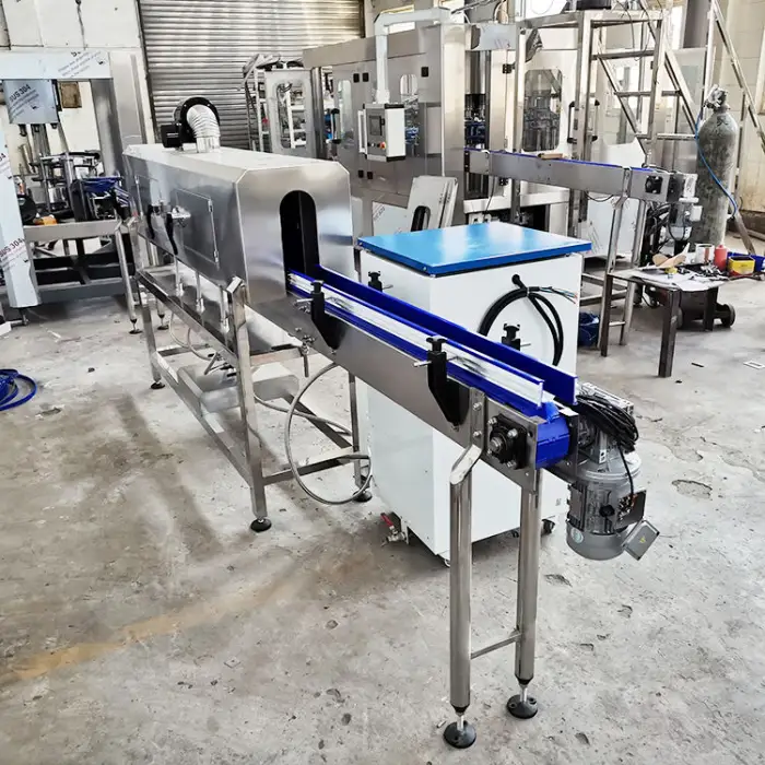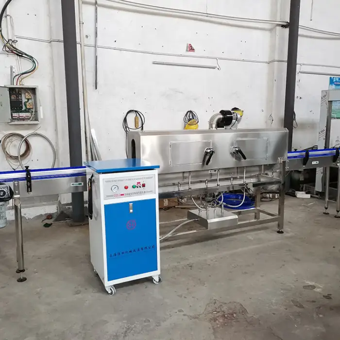 The machine uses steam as its heating method to effectively shrink the sleeves onto the bottles.