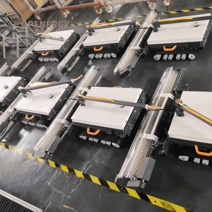 The Smart Clean Robot uses advanced sensors and navigation technology to detect obstacles and navigate around the solar panel array for thorough cleaning.