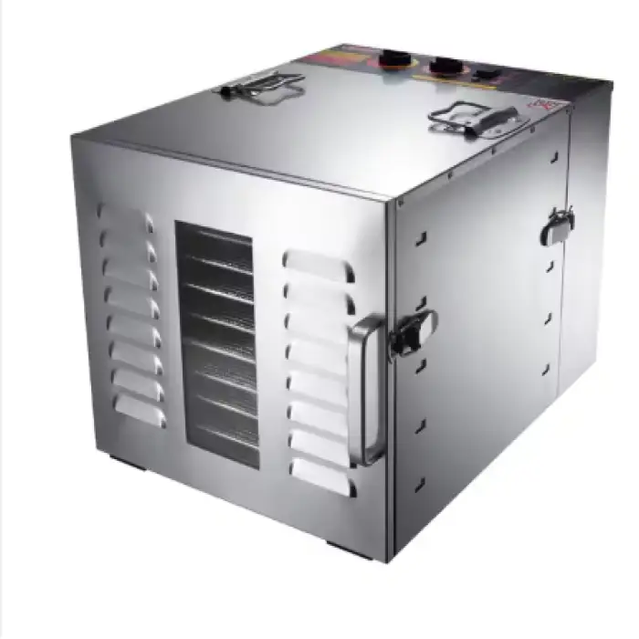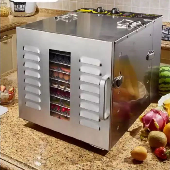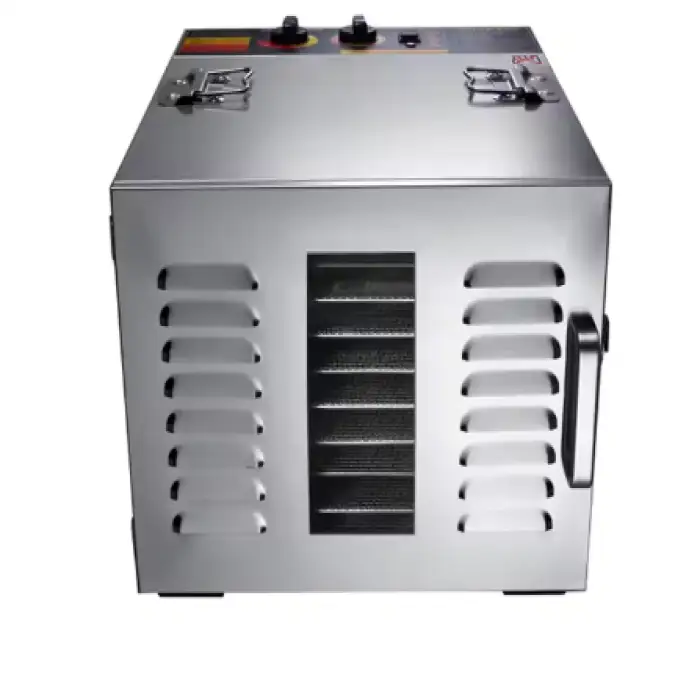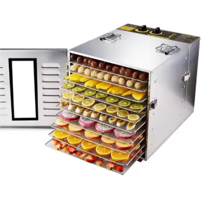 The dehydrator is made from food-grade 304 stainless steel racks and 201 stainless steel housing, with a tempered glass window door.