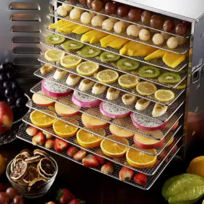 The ST-01 Dehydrator has a large capacity of 10 trays, allowing you to dry 15 to 20 kg of food at a time.