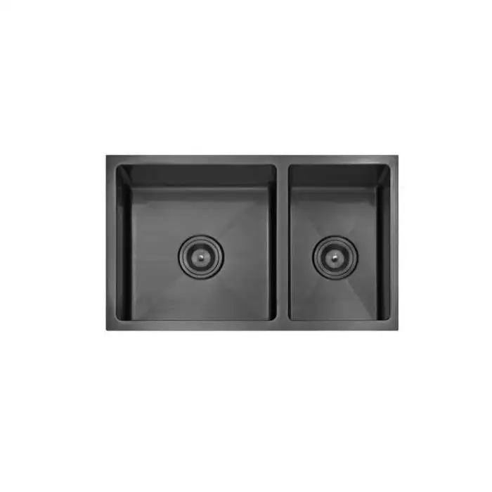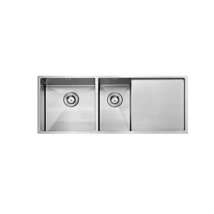 The sink features a double bowl design, allowing for efficient washing and rinsing.