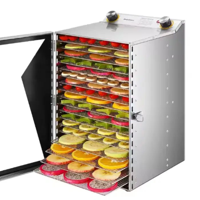 The dehydrator is constructed from durable stainless steel, ensuring longevity and excellent performance.