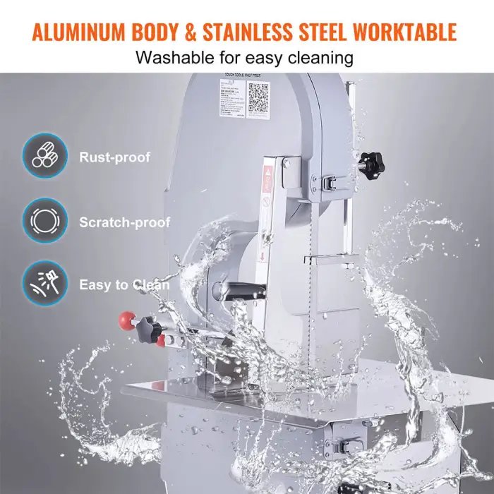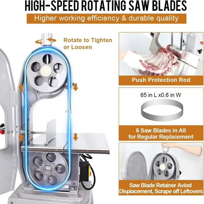 This machine is designed to cut a variety of meats including beef, fish, chicken, and even bones.
