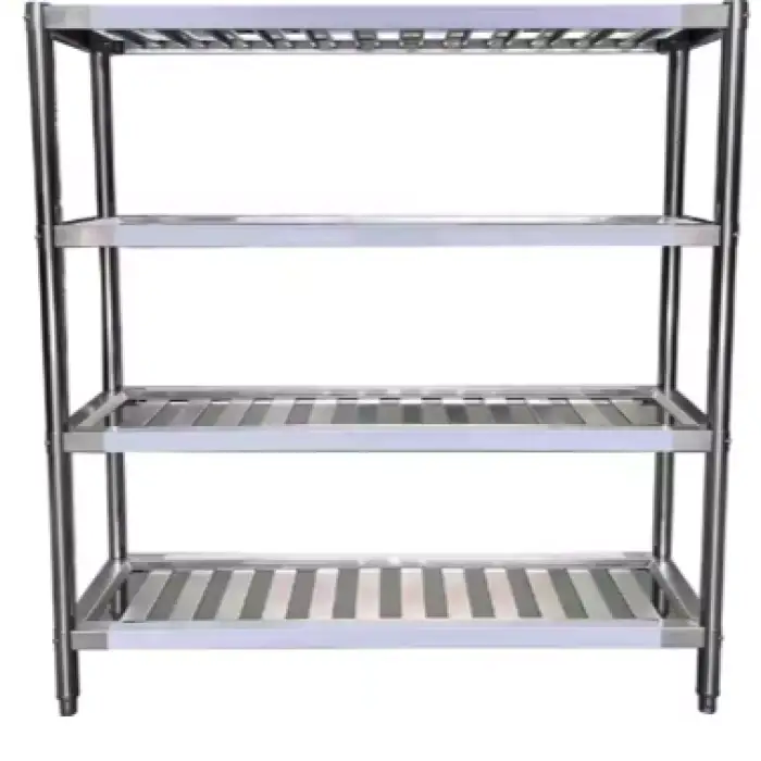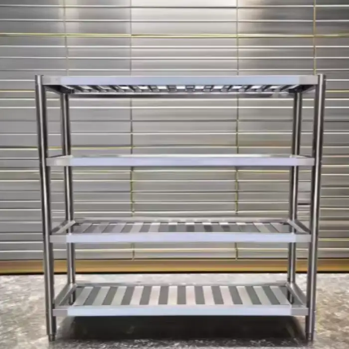 The Stainless Steel Commercial Shelf features 4 spacious tiers for ample storage and display.