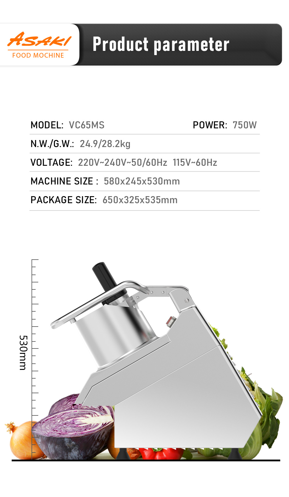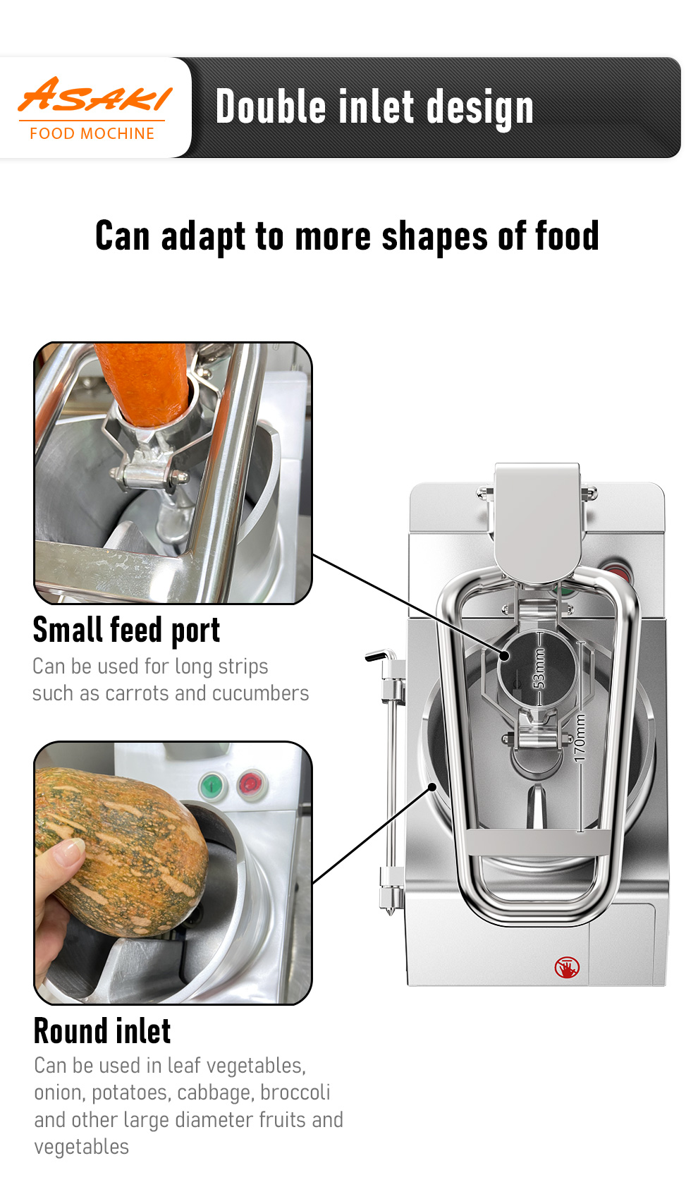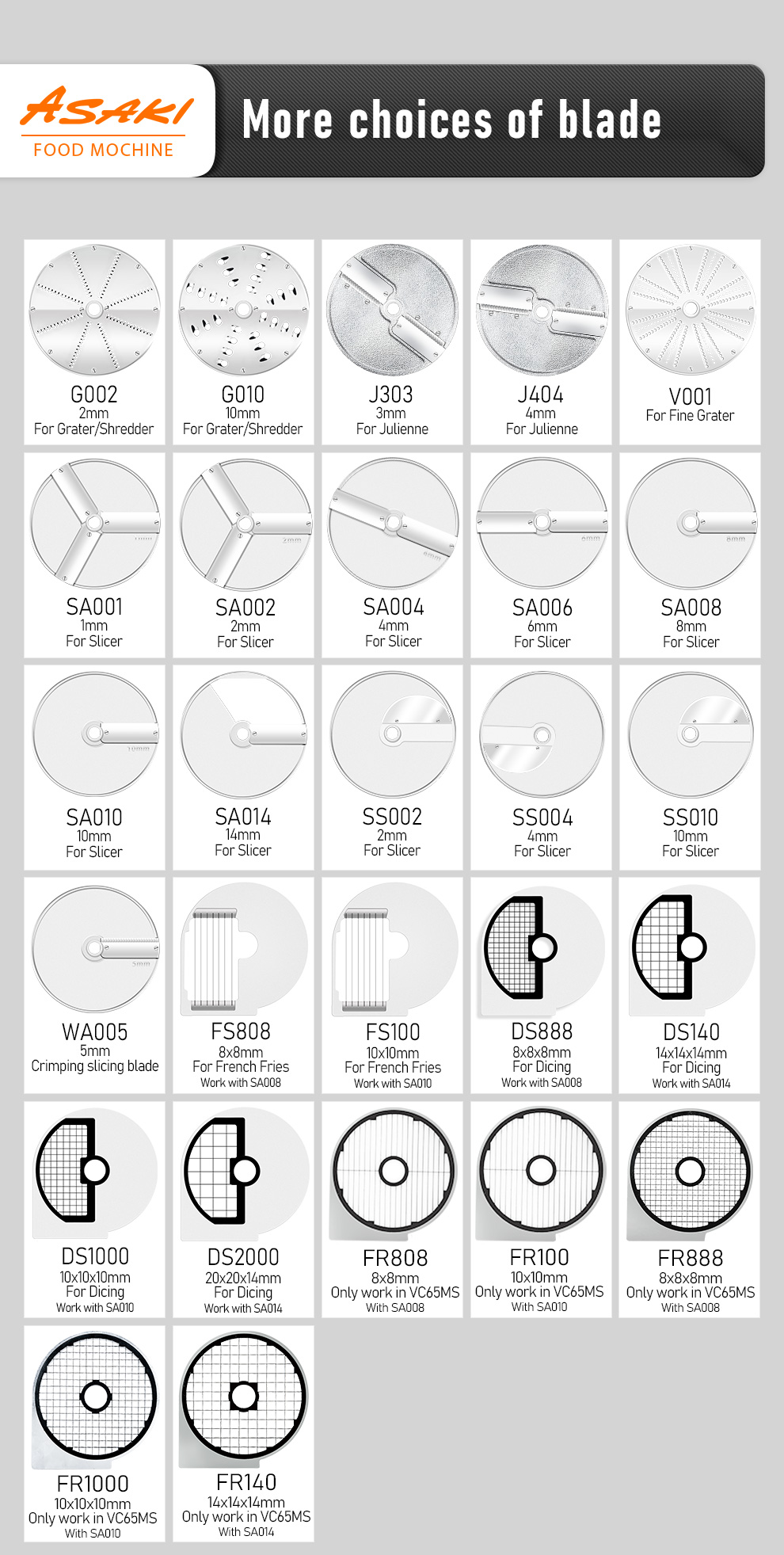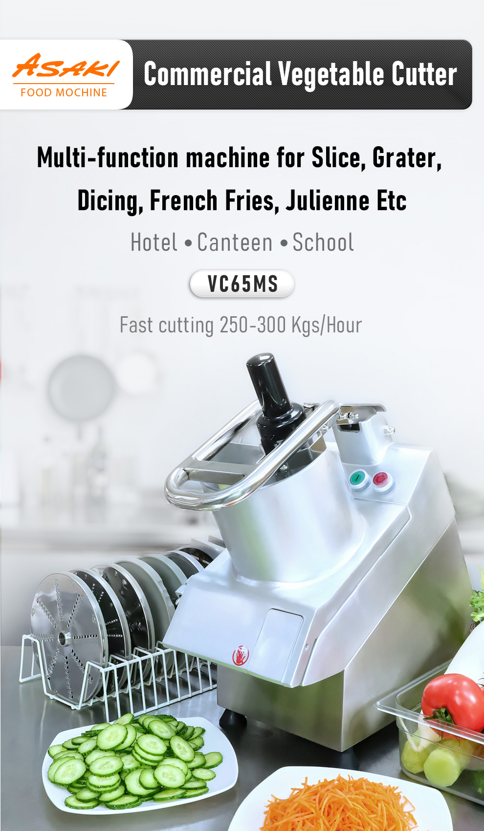 It is designed to slice and dice a wide variety of vegetables and many fruits — for example potatoes, onions, carrots, cucumbers, tomatoes — and other similarly sized produce. It’s suitable for preparing salad ingredients, fries, garnishes and bulk prep in home or commercial kitchens.