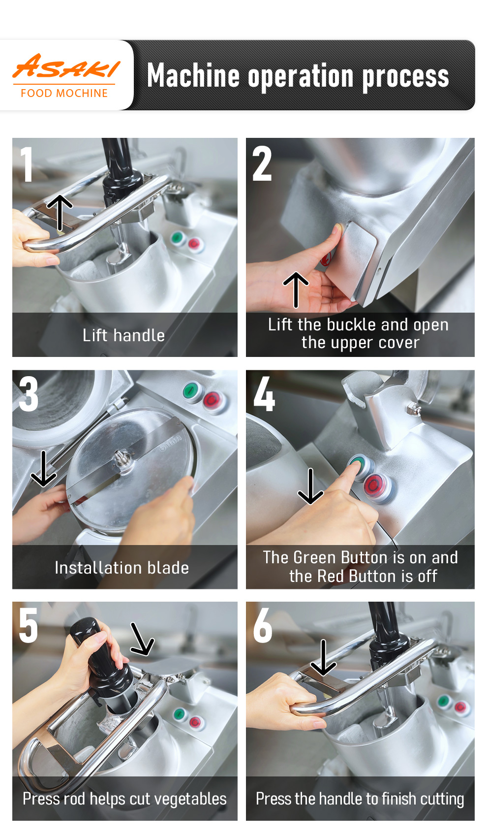 Basic steps: 1) Place unit on a stable, dry surface and lock non-slip feet. 2) Choose and securely install the desired blade. 3) Plug in the machine and switch it on. 4) Feed vegetables through the chute using the pusher (never hands). 5) Turn off and unplug, then remove and clean components. Always follow the full user manual for safety details.