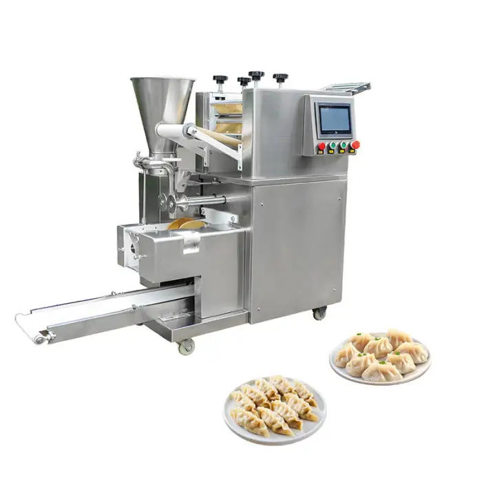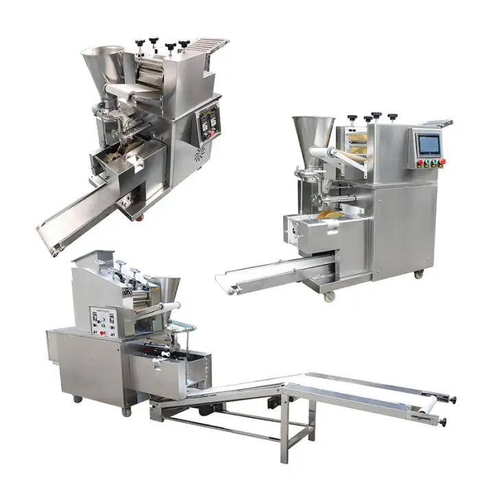 The machine can produce various types of dumplings including samosas, ravioli, empanadas, and pelmeni.