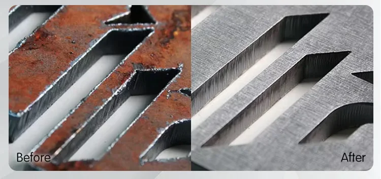 The machine is specifically designed to remove burrs from laser-cut sheet metal, providing a smooth finish.