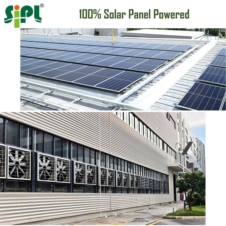 The fan can operate on 100% solar power or in a hybrid system that combines solar with grid or battery power.