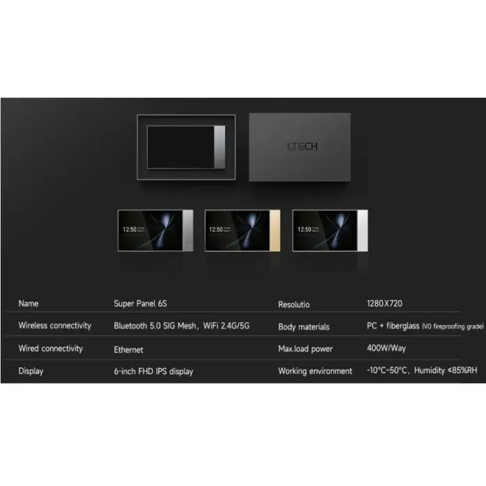 The Super Panel 6S supports both wireless connectivity options, including Bluetooth 5.0 SIG Mesh and WiFi (2.4G/5G), as well as wired connectivity via Ethernet.