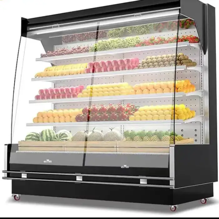 The Supermarket Yogurt Air Curtain Shelf uses a fan cooling system for even temperature distribution.