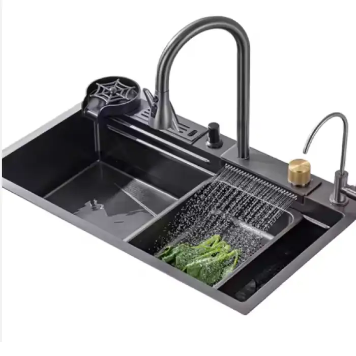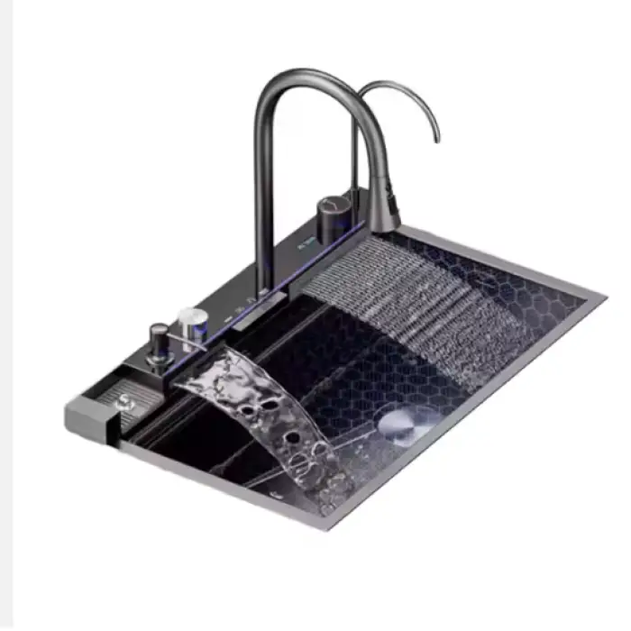 The waterfall style faucet allows water to flow in a smooth, waterfall-like manner, providing both aesthetic appeal and efficient water flow.