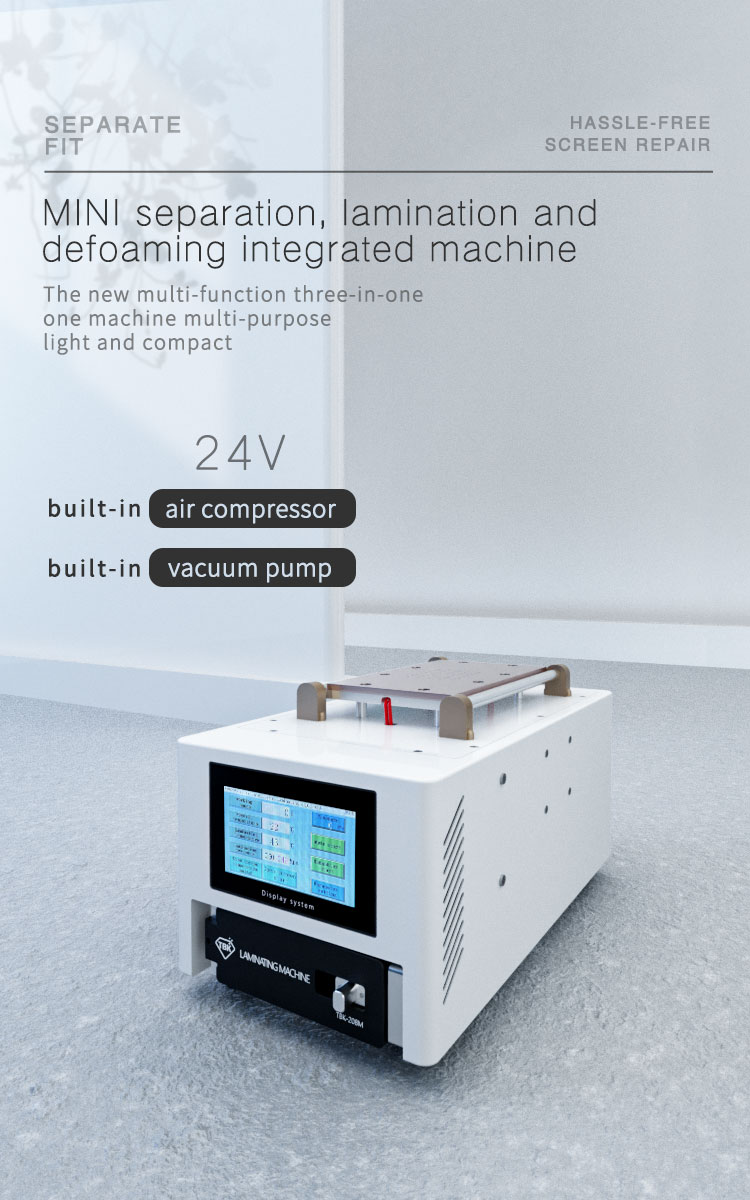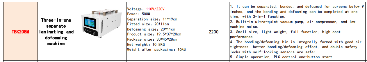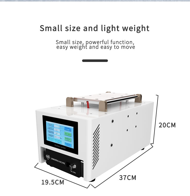 The exact dimensions of the TBK 208M can vary, but it is compact enough to fit on most worktables while providing sufficient workspace for laminating and defoaming.