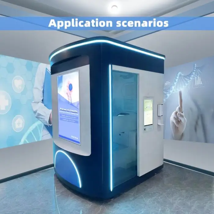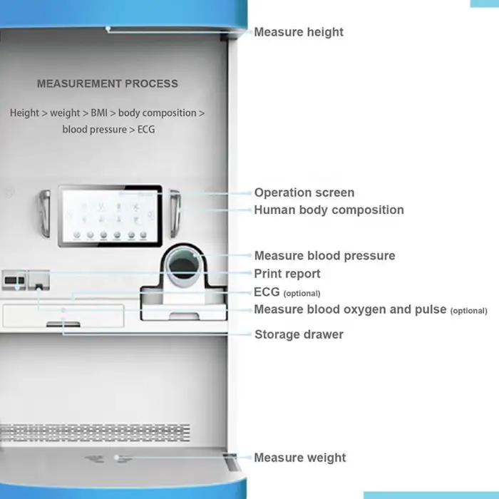The kiosk can monitor height, weight, BMI, body composition, blood pressure, and blood oxygen levels.