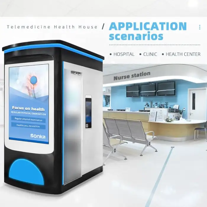 The Sonka Telemedicine Kiosk is used for monitoring vital signs and health metrics in health centers and hospitals, allowing patients to check their health status easily.
