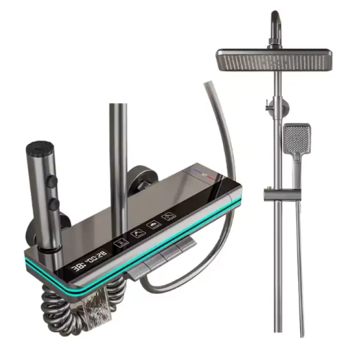 The shower system has a single handle design, making it easy to control both water flow and temperature.