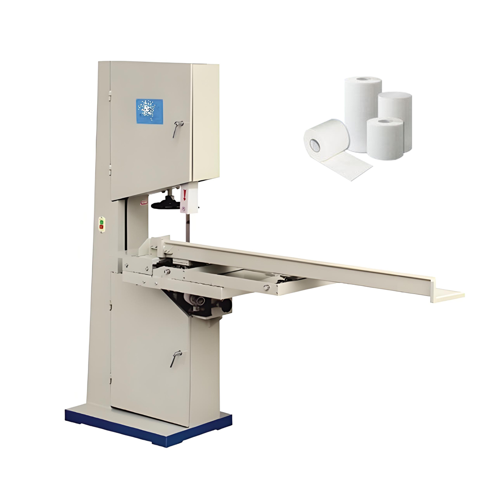 The machine is designed to cut large toilet paper parent rolls into finished toilet paper rolls for retail, hospitals, hotels, and other commercial uses. It streamlines cutting to produce high-quality, uniformly sized rolls.