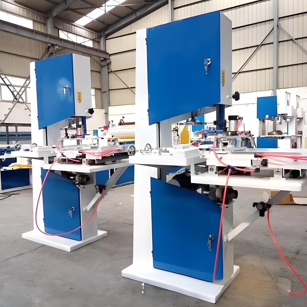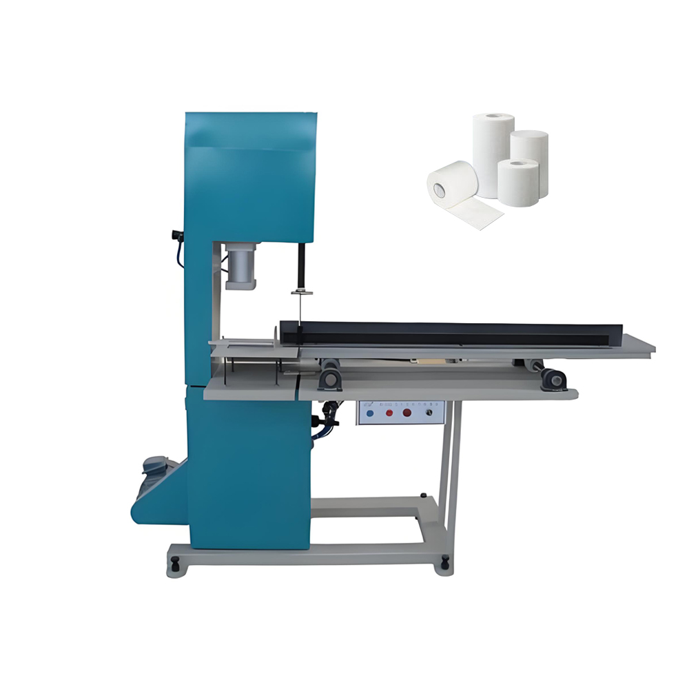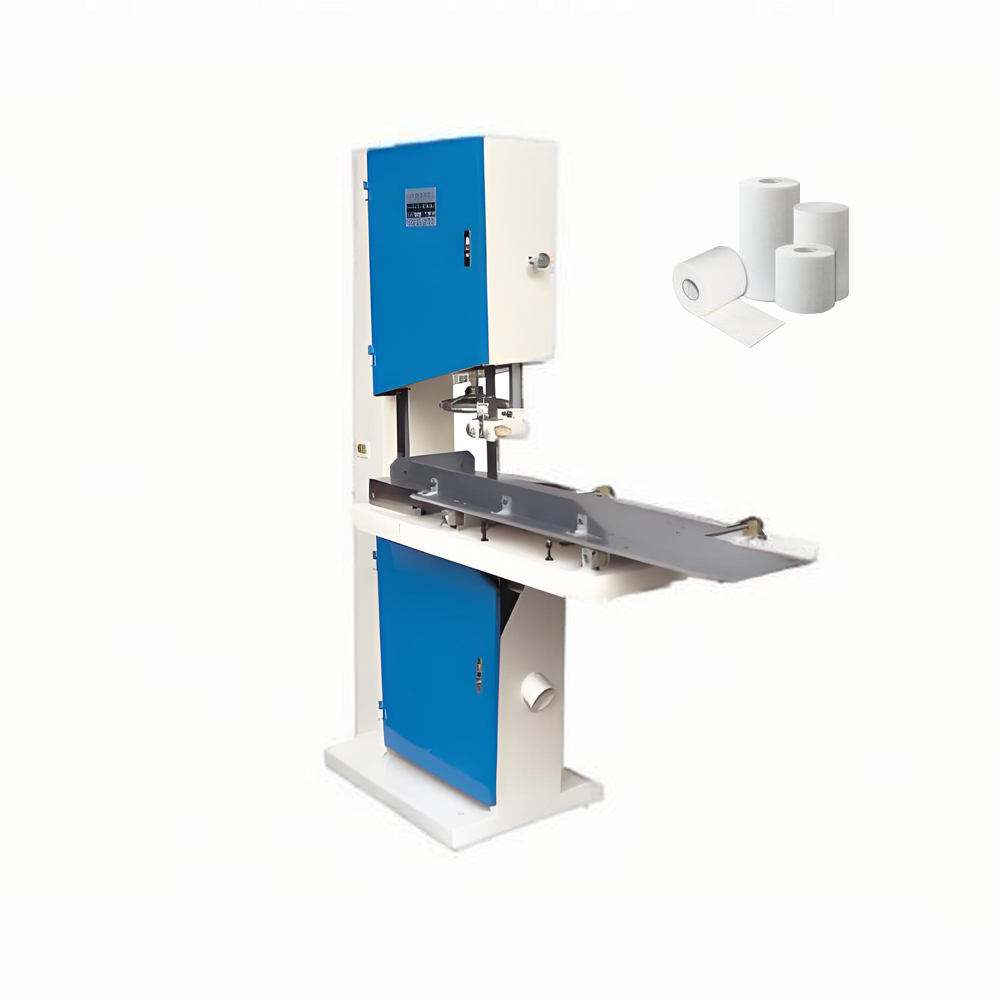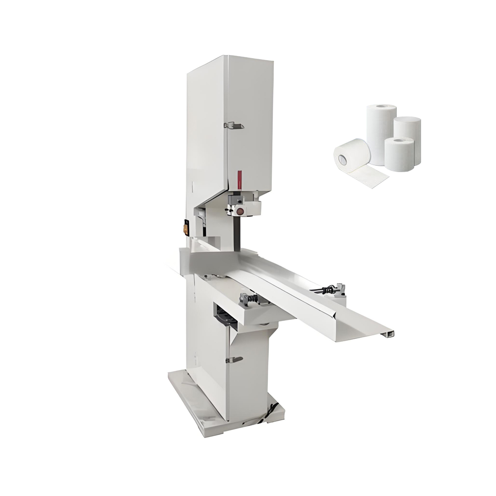 Although marketed as a Manual Toilet Paper Roll Cutting Machine, it uses PLC control and motors for cutting operations. In practice the unit is semi-automatic: an operator typically loads/unloads material while the PLC controls precise cutting cycles.