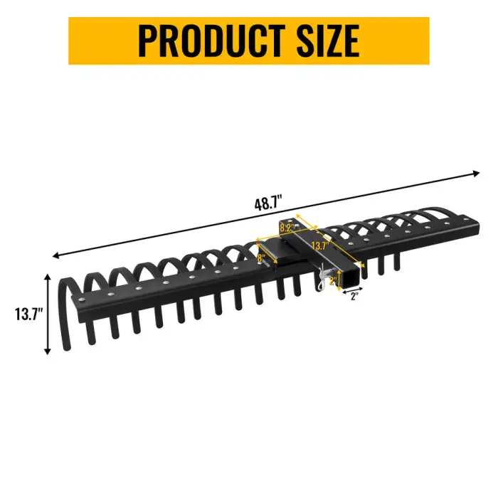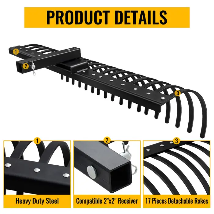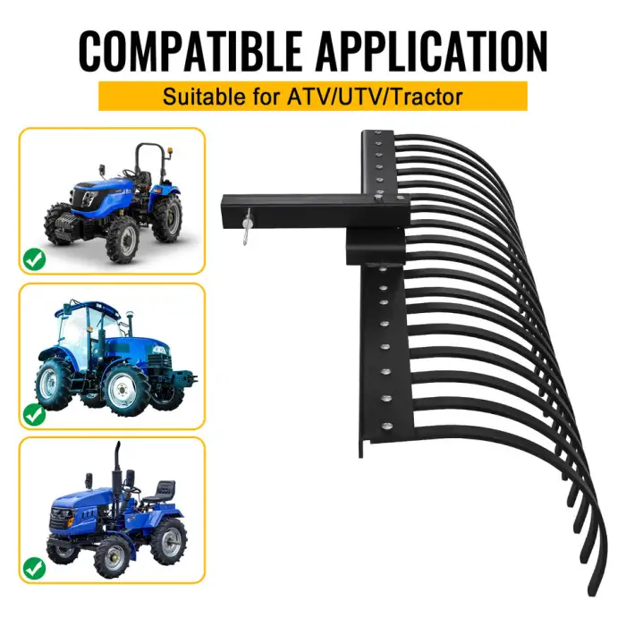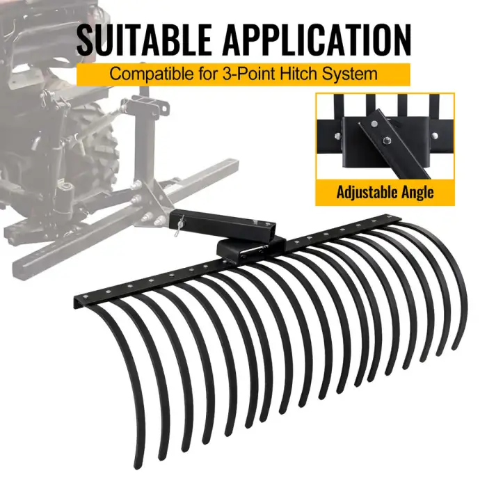 This rake is suitable for leveling lawns and gardens, removing debris from fields, preparing soil for planting, raking loose straw and hay, and general landscaping tasks.