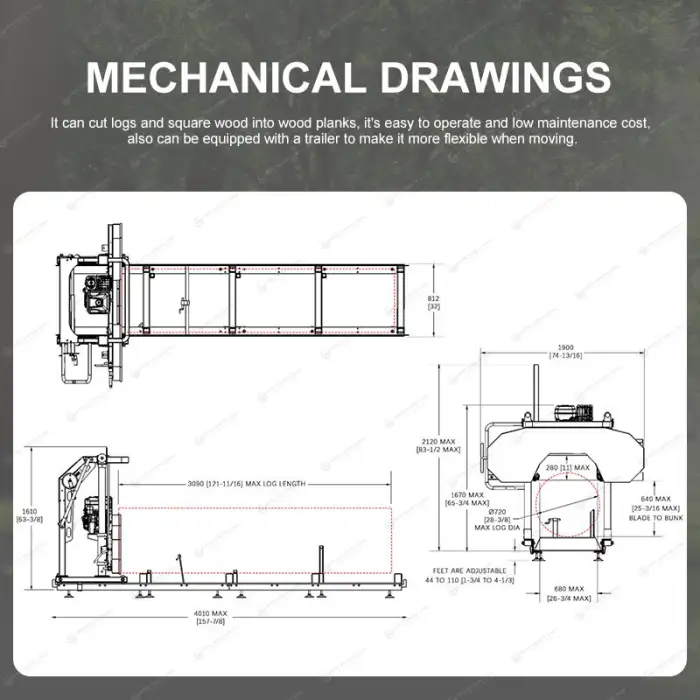 This band saw mill is suitable for cutting various types of wood, including logs for lumber, crafting furniture, and processing firewood.