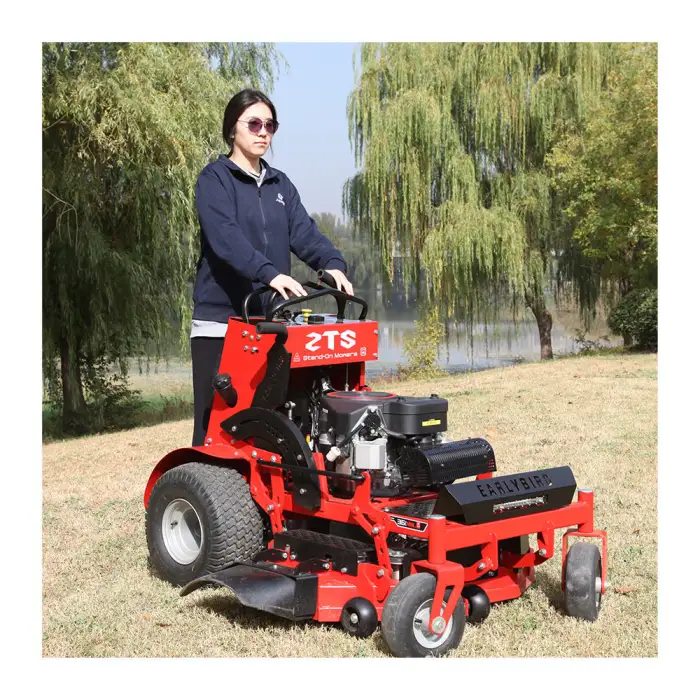 Key features include four-wheel drive for stability, zero turning angle for maneuverability, a standing platform for balance, and a powerful 764CC gasoline engine.