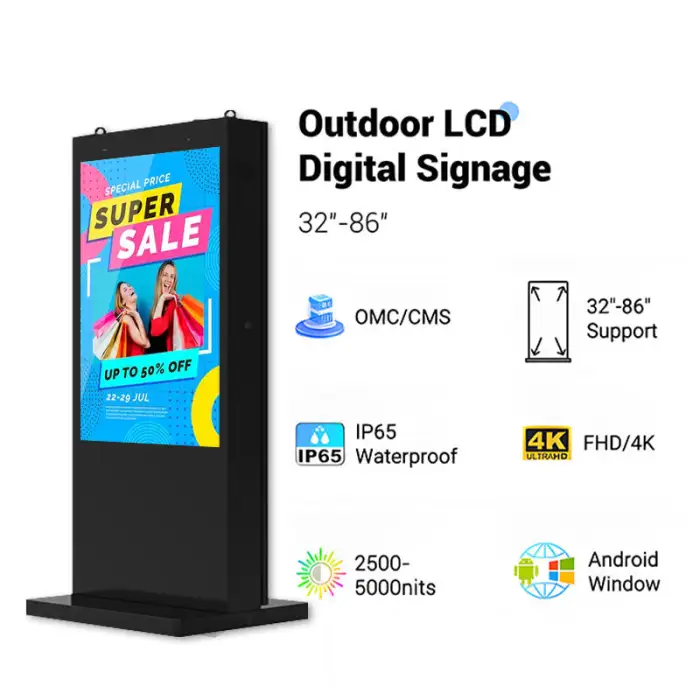 The Waterproof IP65 Outdoor Advertising Equipment is available in three sizes: 43 inches, 49 inches, and 55 inches.