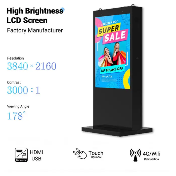 With a brightness range of 2000 to 3000 nits, the digital signage is designed to perform exceptionally well in direct sunlight.